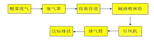 酸霧廢氣:廢氣由風(fēng)機(jī)引出后,首先進(jìn)入酸霧廢氣凈化塔。吸收塔中堿性洗滌液由循環(huán)泵抽至塔中經(jīng)填料向下流動,酸霧廢氣逆流上升,在填料的濕潤表面氣液接觸,發(fā)生一系列的物理化學(xué)反應(yīng),并由于濃度差而發(fā)生傳質(zhì)過程,從而完成了將氣體的凈化過程,凈化后的廢氣脫水后經(jīng)離心風(fēng)機(jī)引出后達(dá)標(biāo)排放。循環(huán)液定期排放至污水處理站;